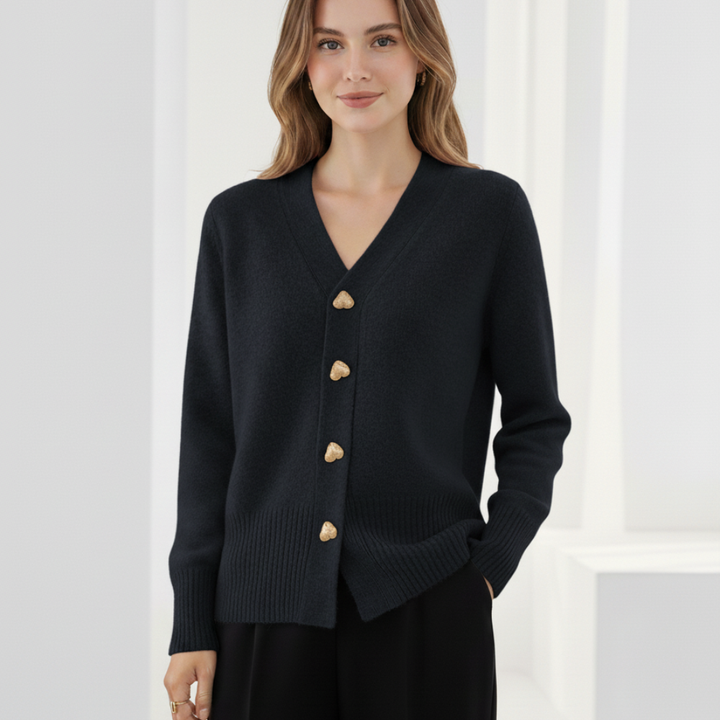 Creato per portare fascino e comfort al tuo guardaroba, si distingue per i delicati bottoni a cuore e lo scollo a V che valorizza la silhouette. Perfetto sia per l’uso quotidiano che per le serate speciali, aggiunge sempre un tocco di raffinatezza.